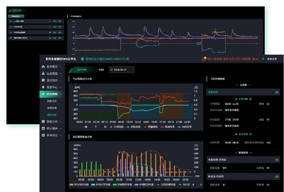 EMS系统从整个场站的视角展示源网荷储能量流转的实时情况,并聚合统计电网、负载、储能、光伏以及充电桩等节点的实时功率和电量数据。该系统还支持显示当前场站的运行策略、储能电池的状态以及系统的一次接线图等信息。