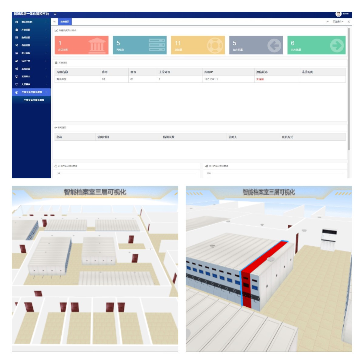 - 通过三维数字化库房,可实现业务数据查询,远程档案设备操作,全景环控系统设置,安全态势感知上报等功能,助力用户数字化转型。