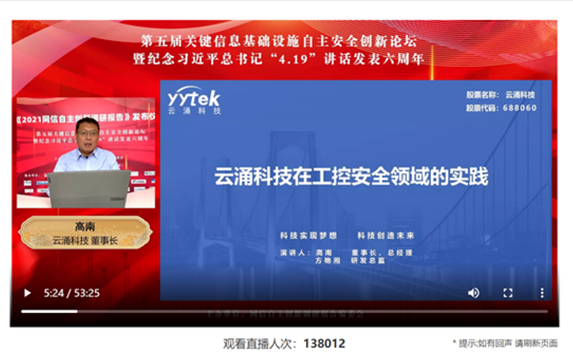 在大会企业线上专场环节,mg冰球突破官网董事长高南和研发总监方艳湘,为大会带来了《mg冰球突破官网在工控安全领域的实践》的精彩演讲.