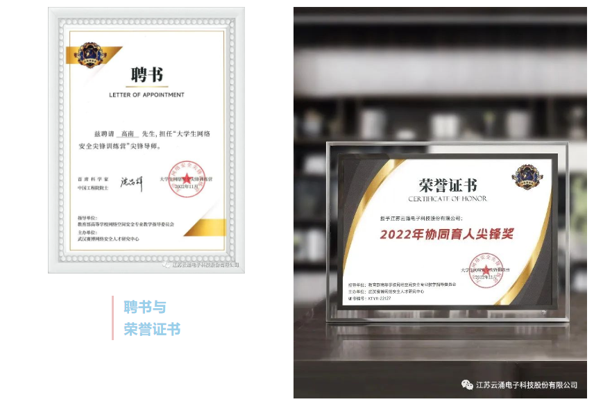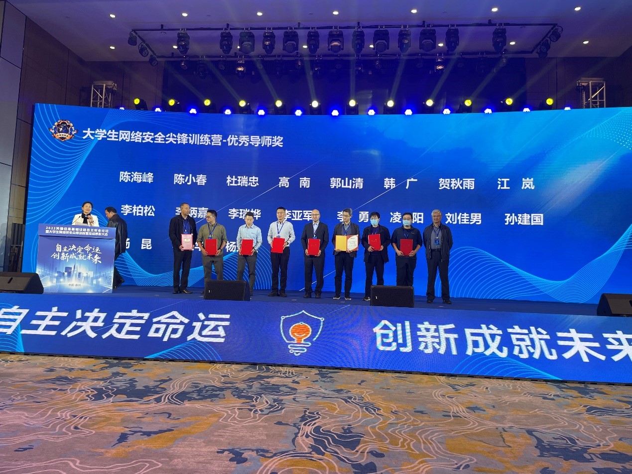 在大学生网络安全尖锋训练营2022年度总结表彰仪式上,公司董事长高南先生荣获优秀尖峰导师奖,冰球突破荣获2022协同育人尖峰奖。
