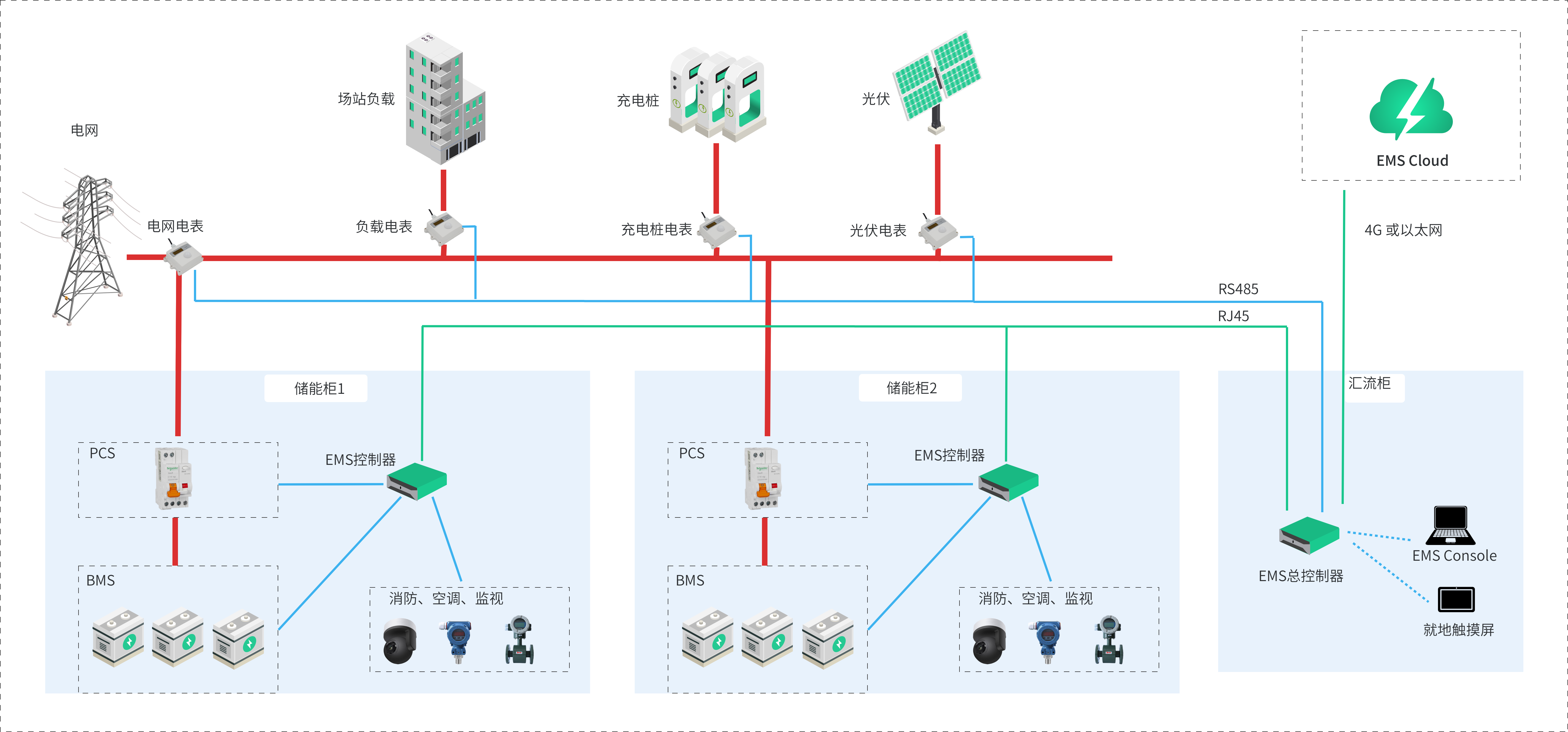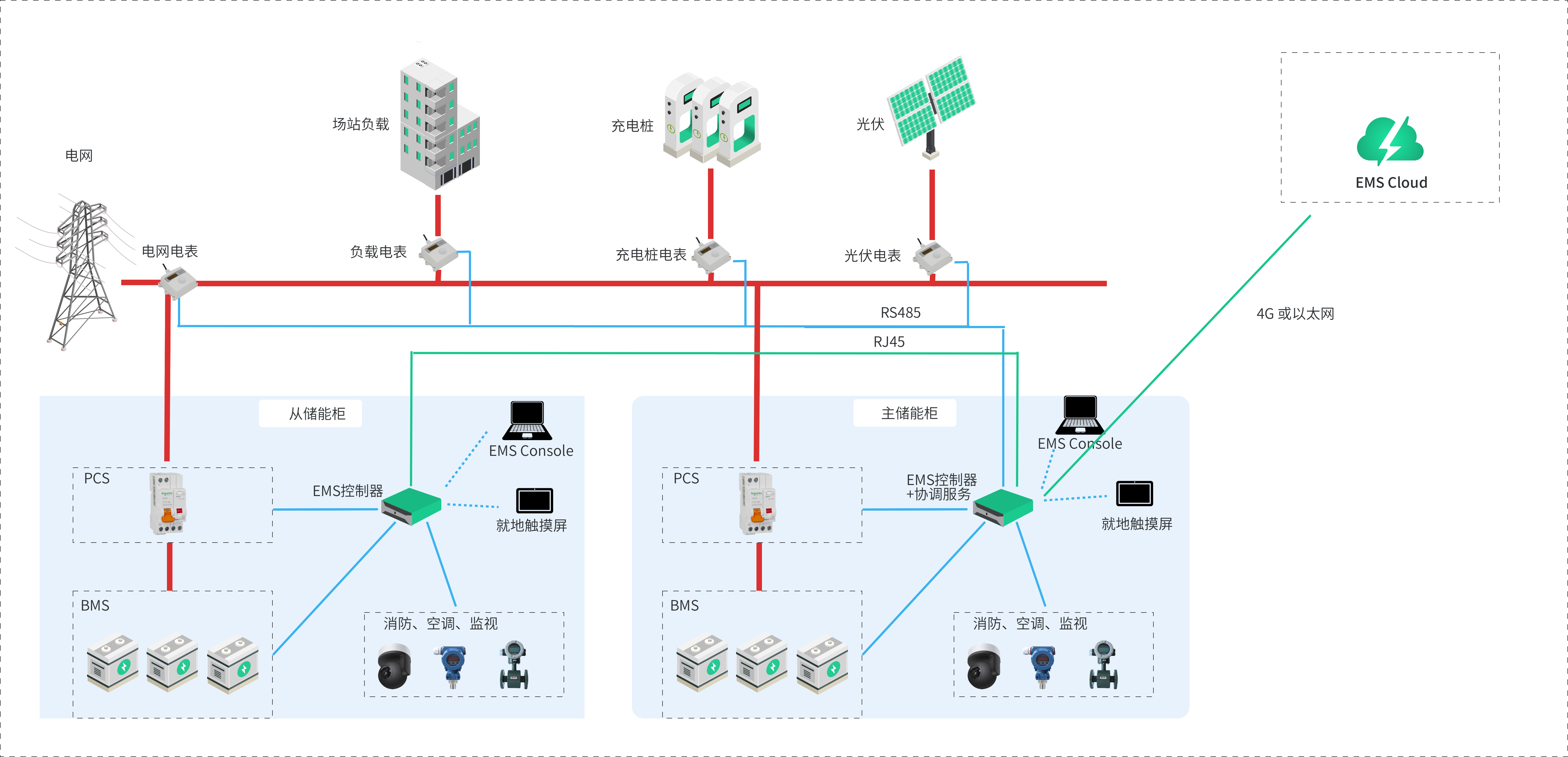 所有柜体内只有一个控制器,并放置于主柜中,主柜EMS控制器通过以太网与所有从柜进行通讯交互,从柜中安装采集或者转换装置,用于在主柜控制器与从柜各组件设备之间做数据转发。